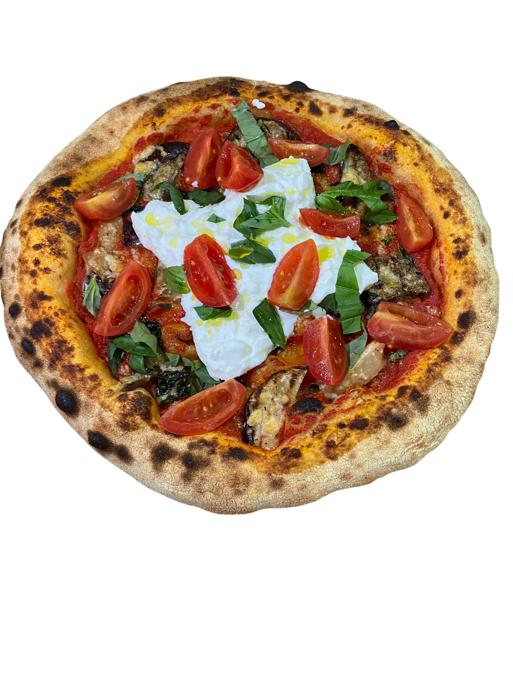 Pomodoro, Melanzane gratinate, Burrata, Pomodorini, Basilico fresco, Olio evo, Aglio